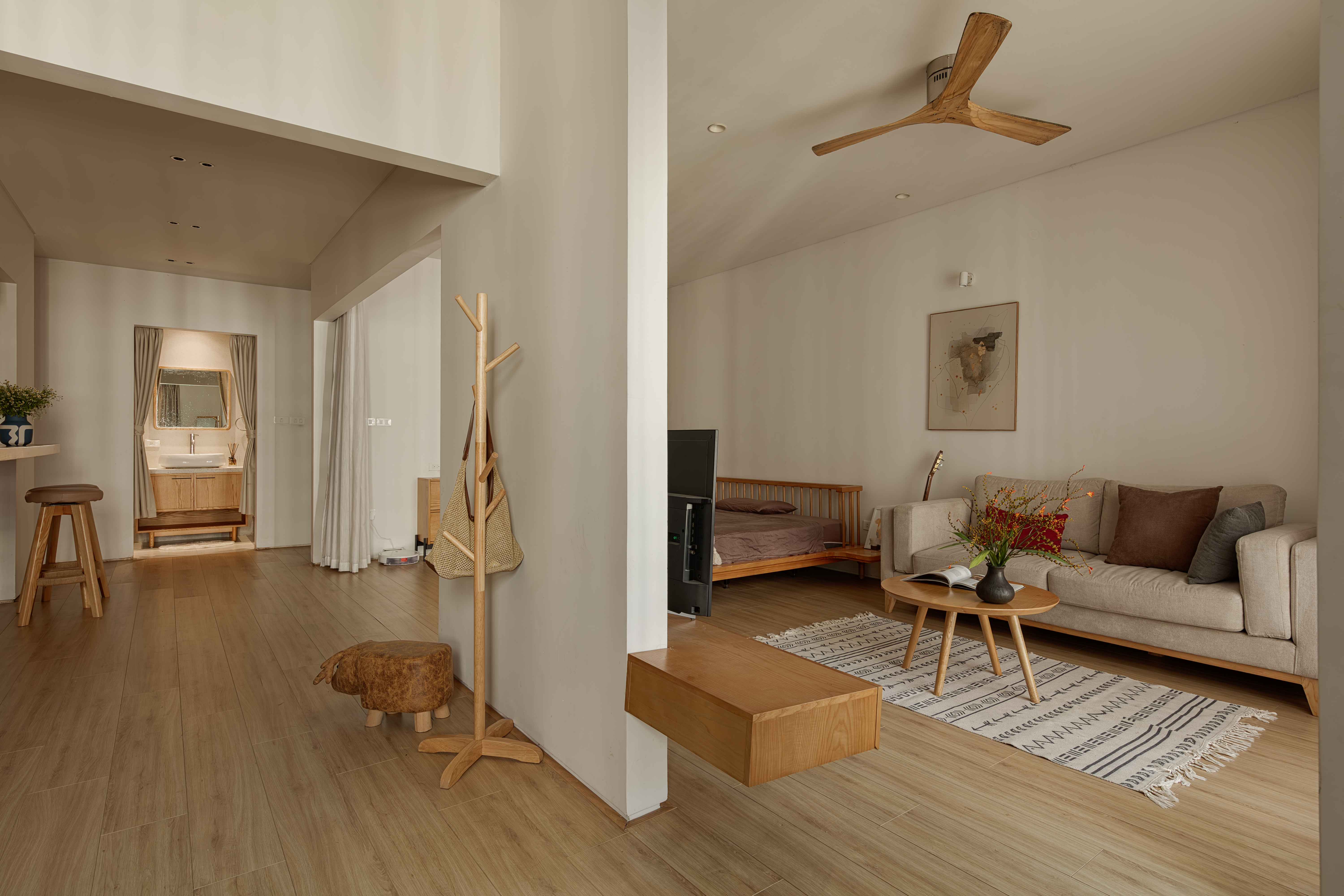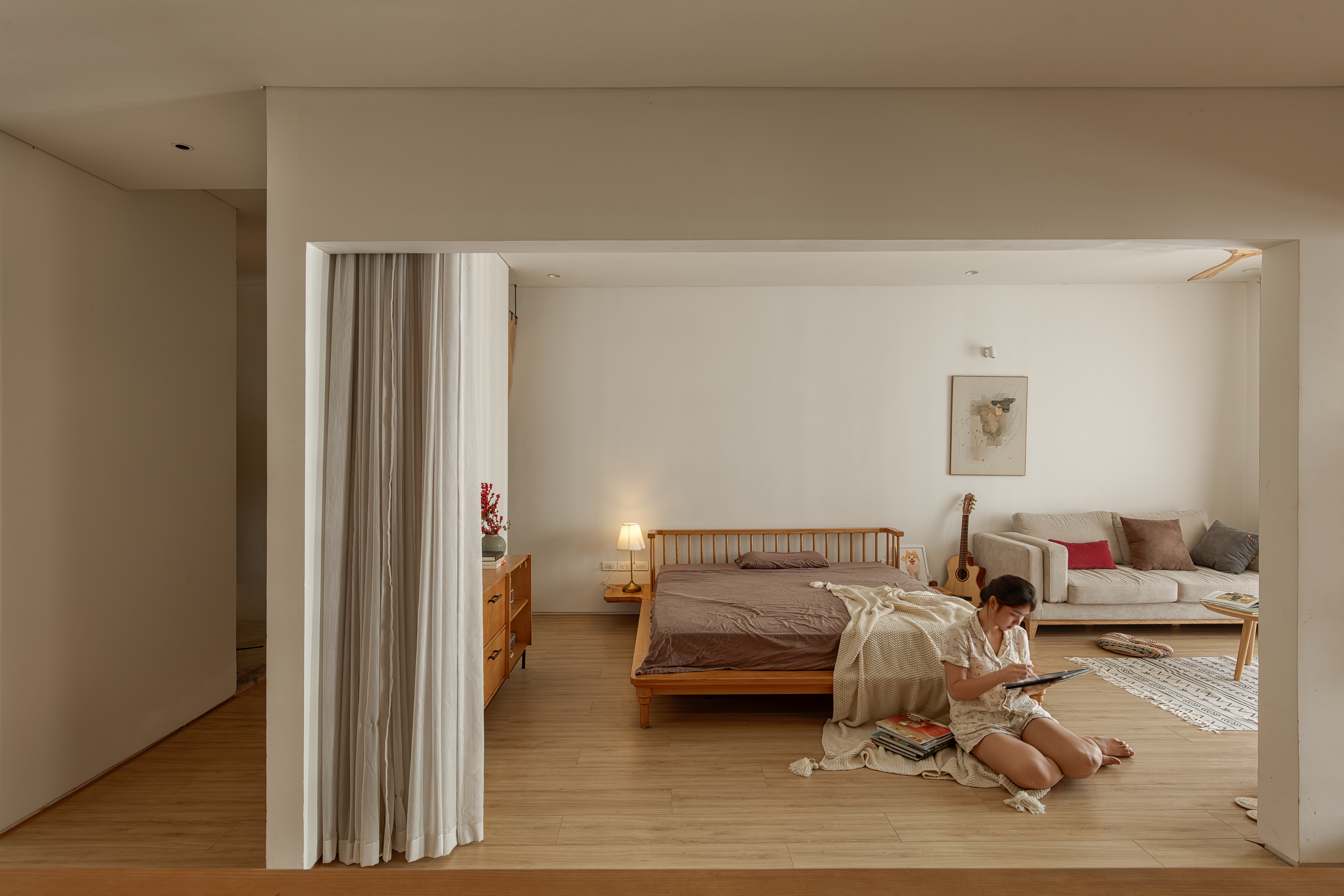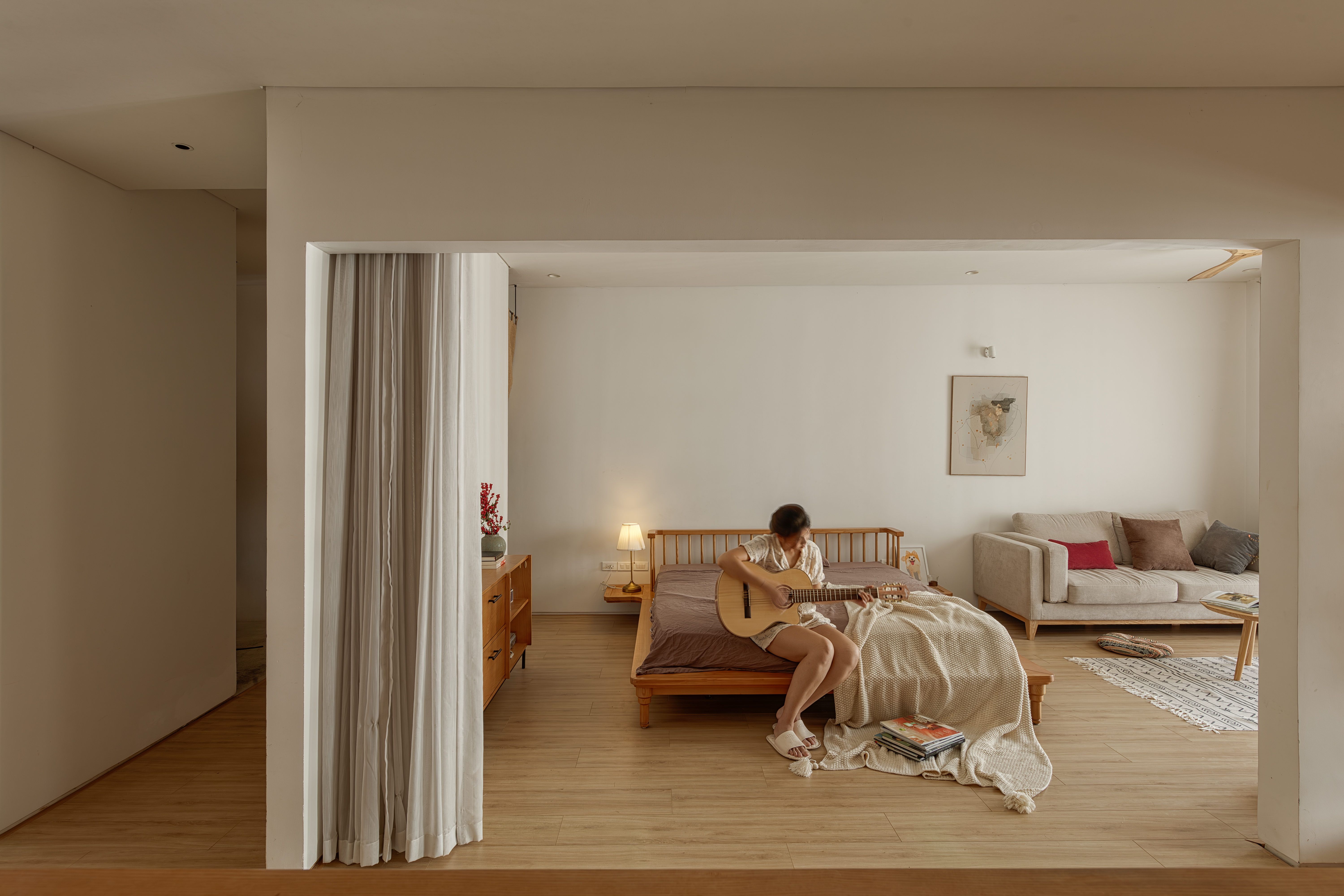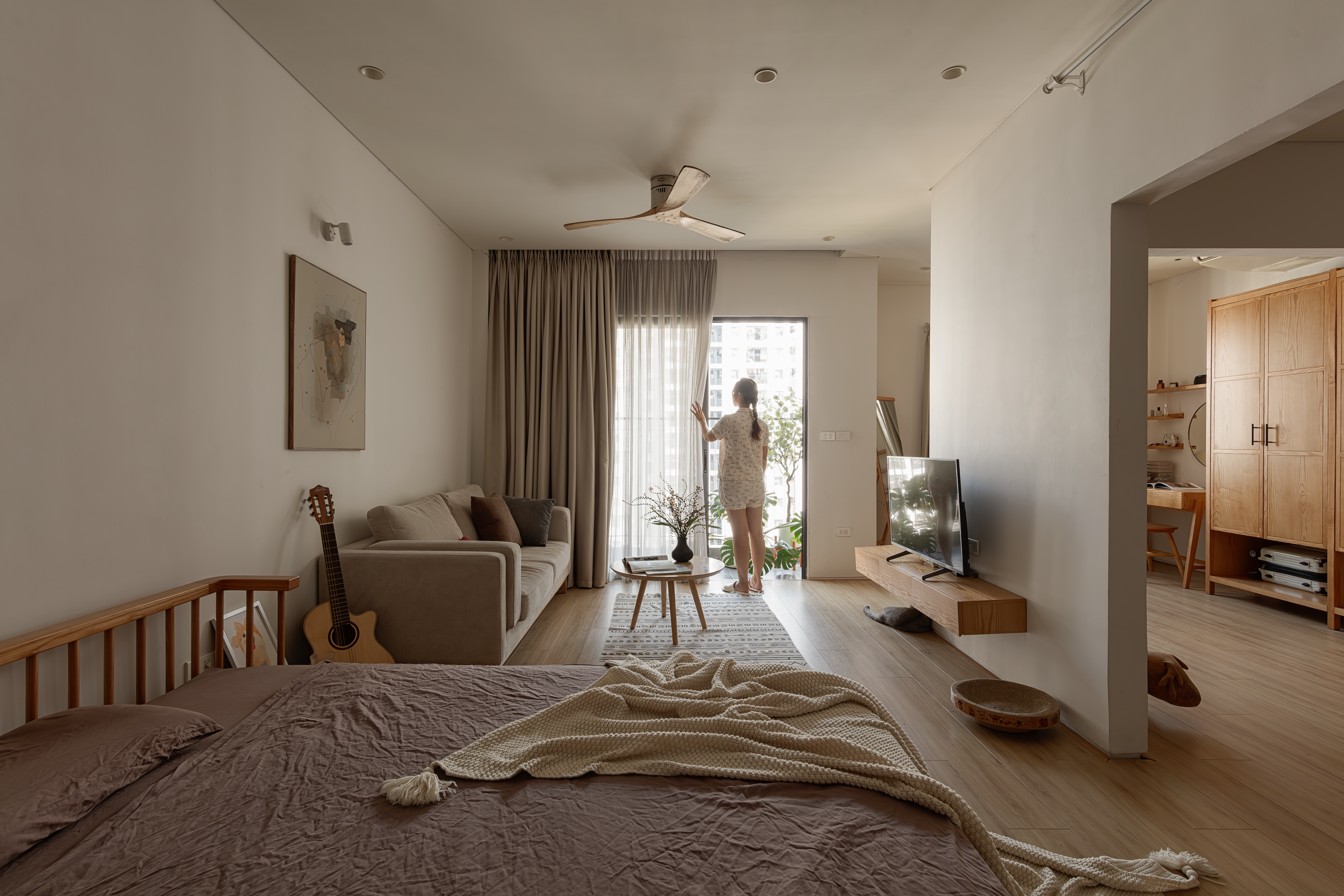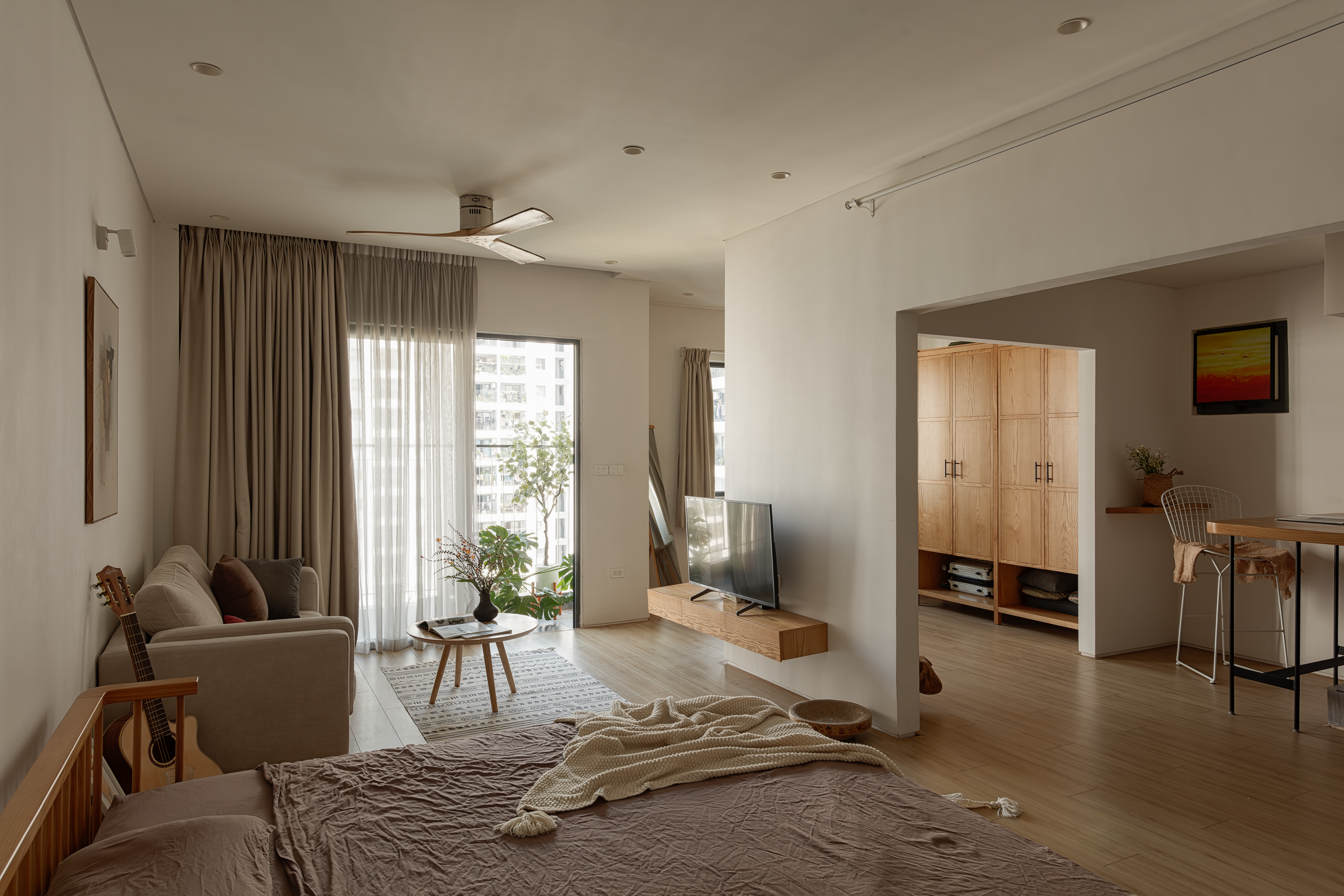Trong dự án này, TNT Architecture lựa chọn cách tiếp cận đặc thù: tổ chức lại mặt bằng 76m² theo hướng tối ưu trải nghiệm của một người sử dụng duy nhất, đảm bảo sự riêng tư, tiện nghi và tính linh hoạt trong sinh hoạt hằng ngày.